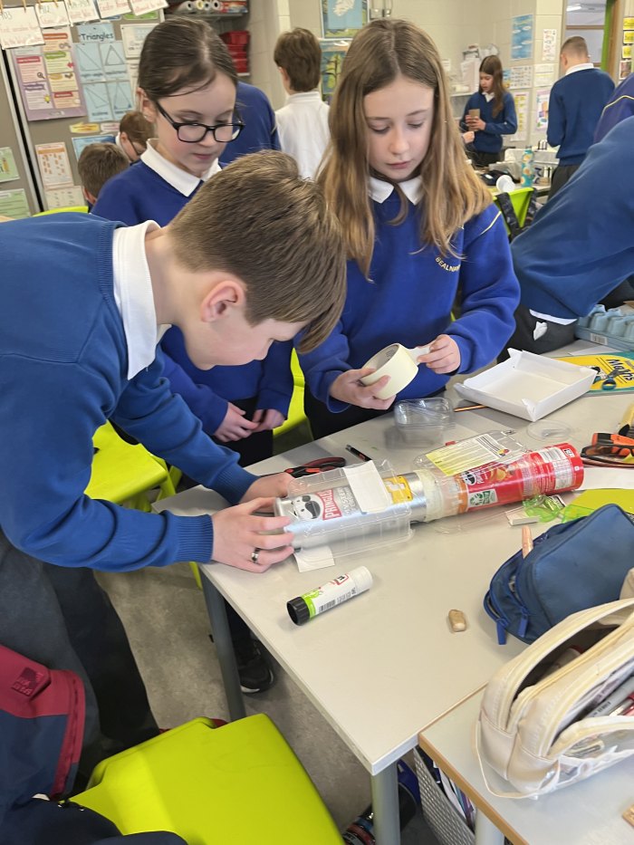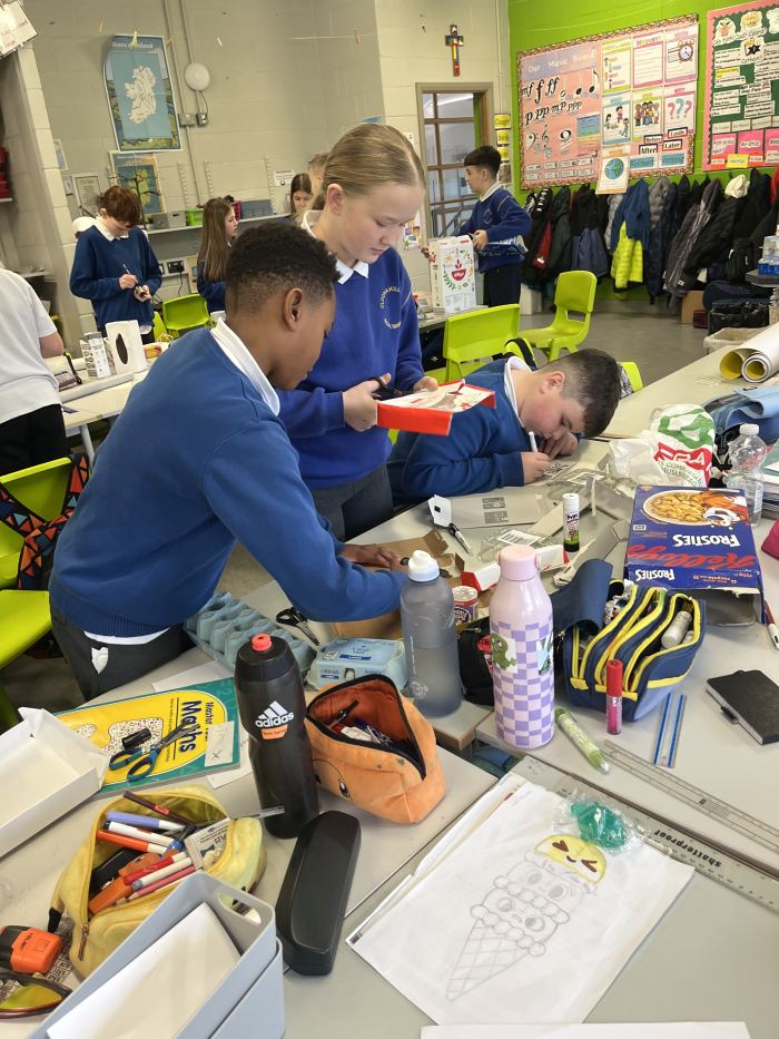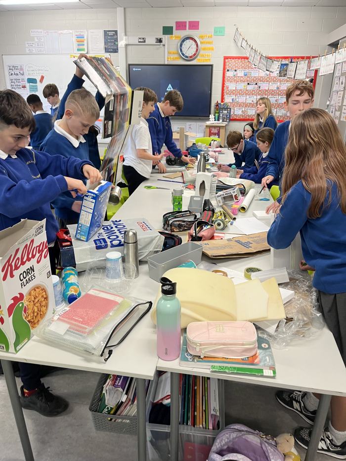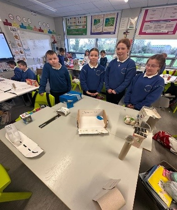For the main Sustainable Communities workshop, pupils worked in groups to design and build a sustainable version of the Athlone/Cloonakilla area. They were encouraged to bring recyclable and reusable materials, including cardboard boxes, empty yogurt pots, cardboard tubes, and plastic trays. The 5th classes thoroughly enjoyed the workshops, applying creativity and teamwork to build imaginative and sustainable communities!