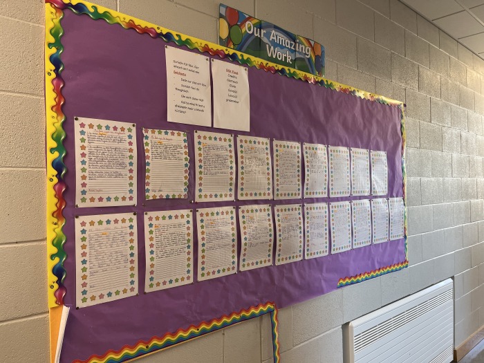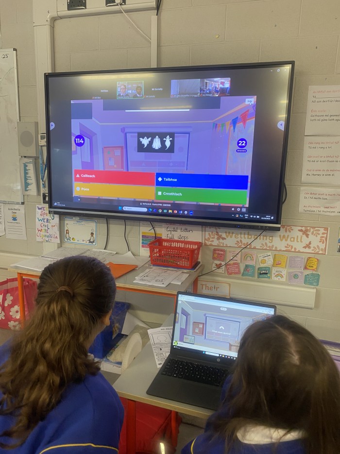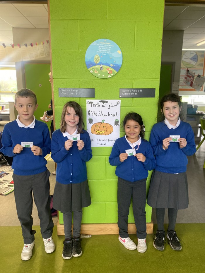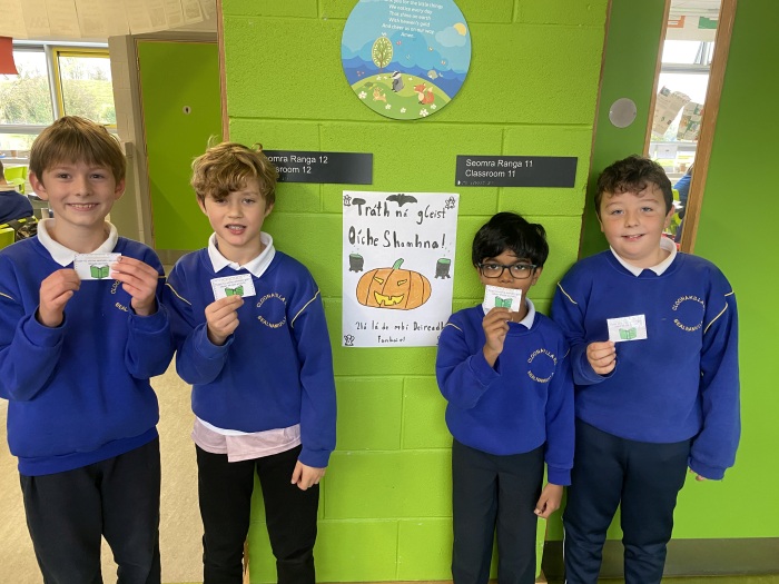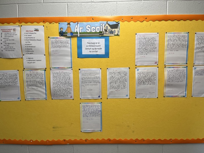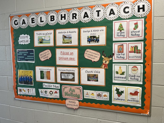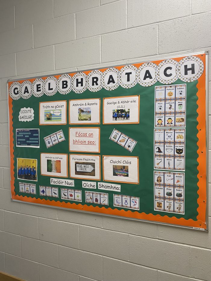 Tá Zon Gaelach cruthaithe againn sa scoil chun an Ghaeilge a cheiliúradh agus a úsáid go laethúil. Sa spás seo, tá ár mBord Gaelbhratach le fáil, ina bhfuil: