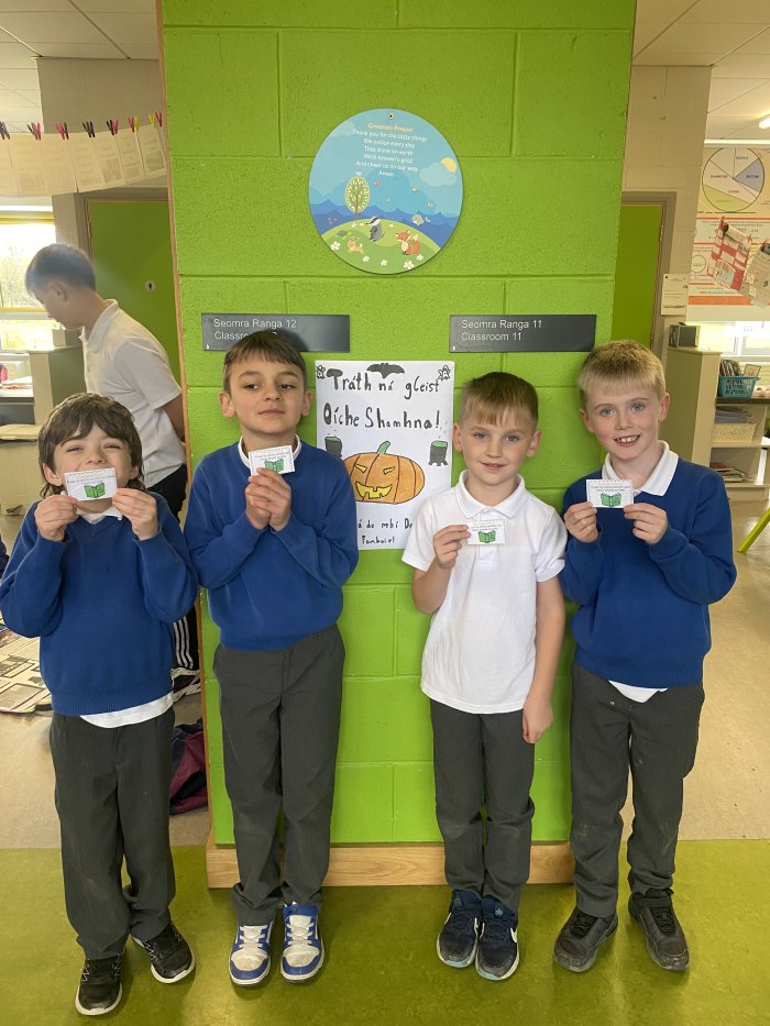 Spreagtar gach duine an Ghaeilge a úsáid timpeall na scoile agus bród a bheith againn as ár dteanga agus ár gcultúr.