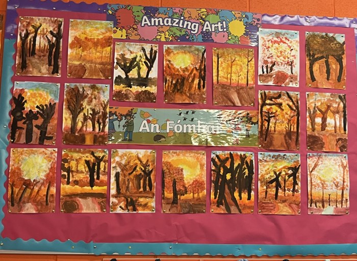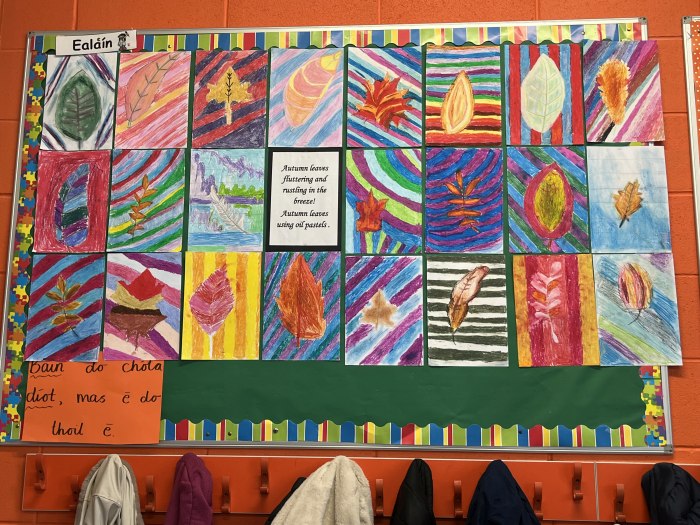 Our Art lessons were bursting with colour through autumn leaf work in oil pastels and painted seasonal trees. Wellbeing, PE and the Skipathon have been enjoyed so far also. In English, the class enjoyed learning and performing new poems with great expression and enthusiasm. In Geography, we explored the provinces and counties of Ireland and followed the fascinating journey of the River Shannon from source to sea.