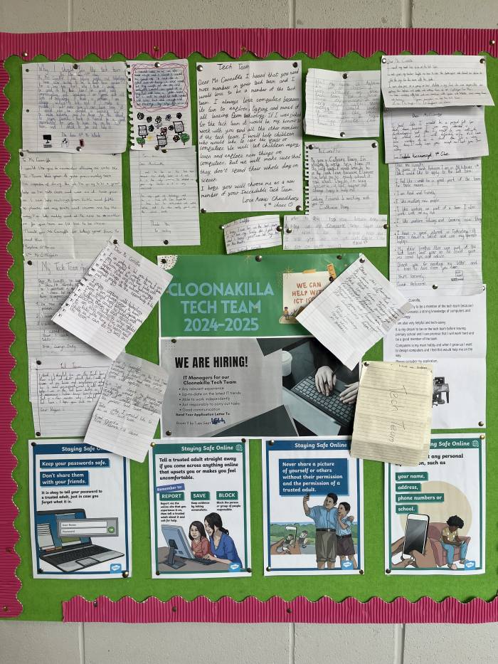 Earlier this month, pupils from 4th, 5th & 6th classes were asked to write a letter of application to state reasons why they felt they should be given a position on this year’s “Tech Team”. There were superb entries but in the end, here are the worthy winners.